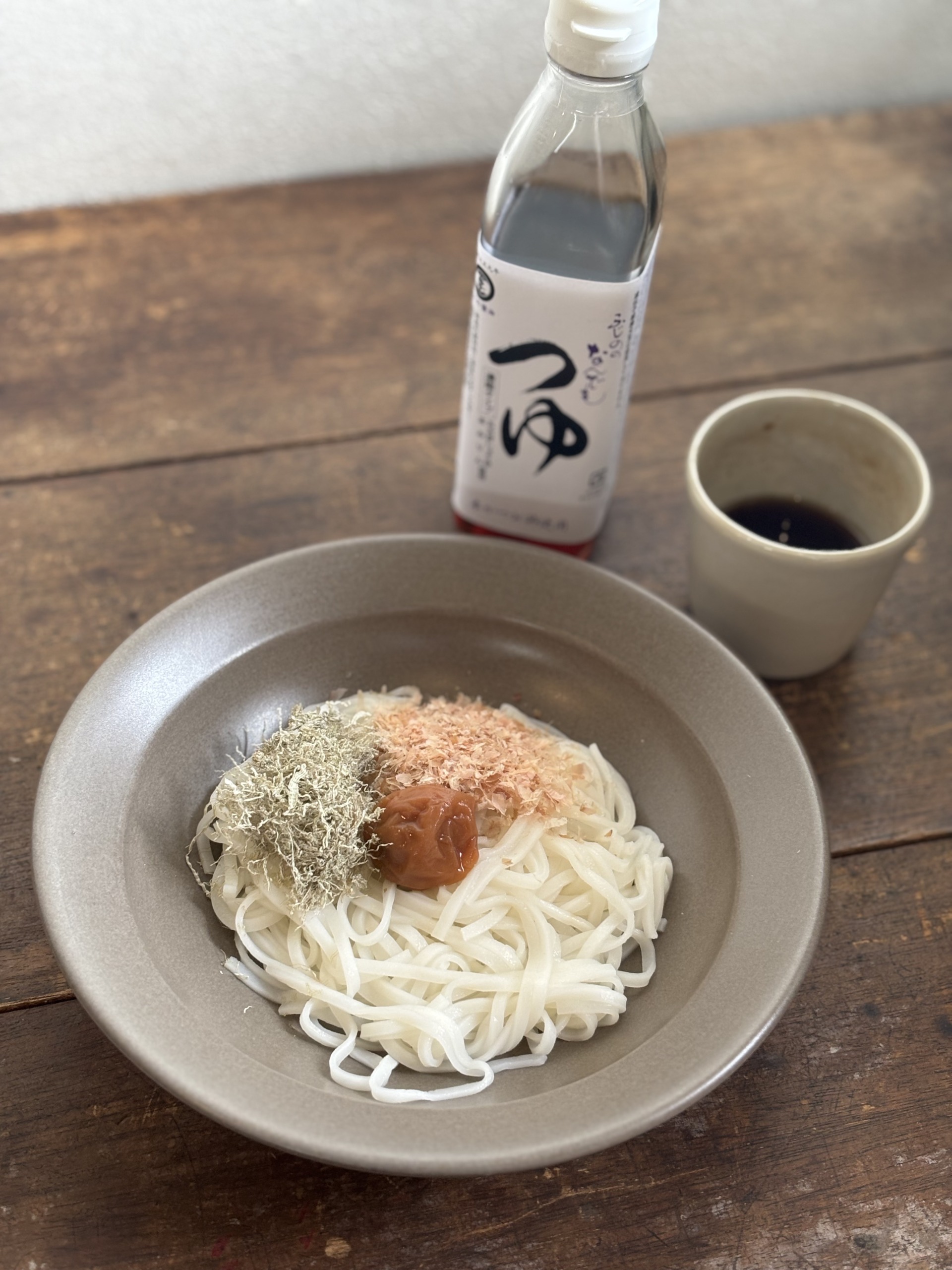 ③梅干し、鰹節、とろろ昆布をトッピングして、めんつゆをかけていただく。